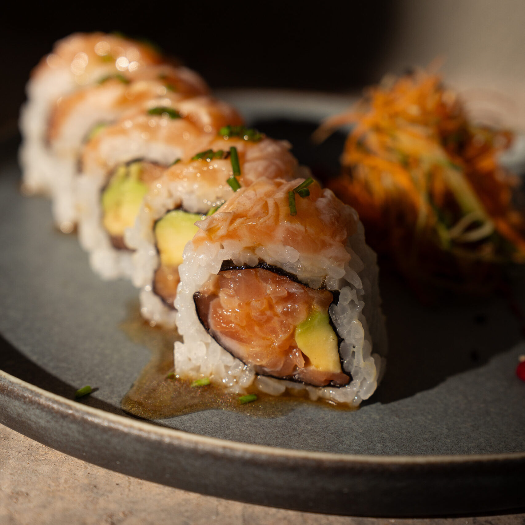 Tartar de salmón, palta, cubierto de salmón. Salseado con salsa oriental.