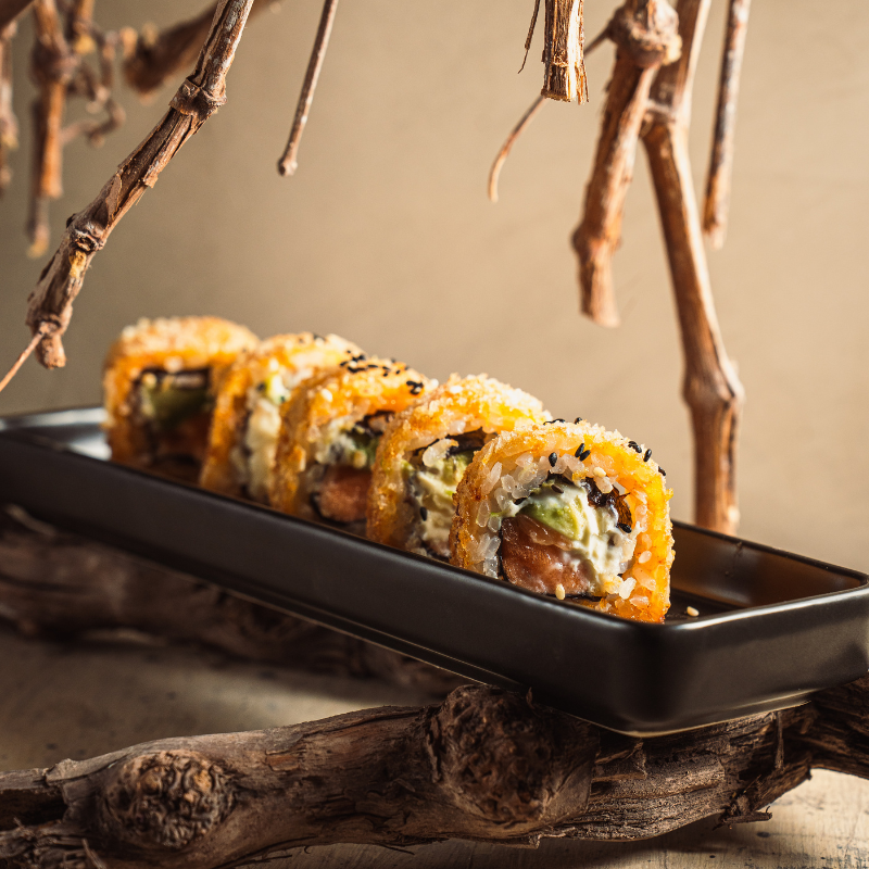 Salmón cocido, queso, palta, apanado. Salseados con teriyaki.