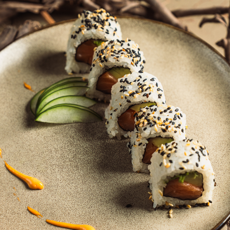 Salmón fresco, palta mix de semillas. Salsa de soja.
