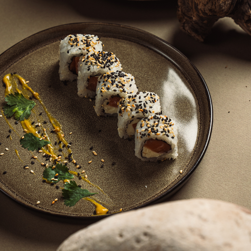 Salmón fresco, queso, mix de semillas. Salsa de soja.